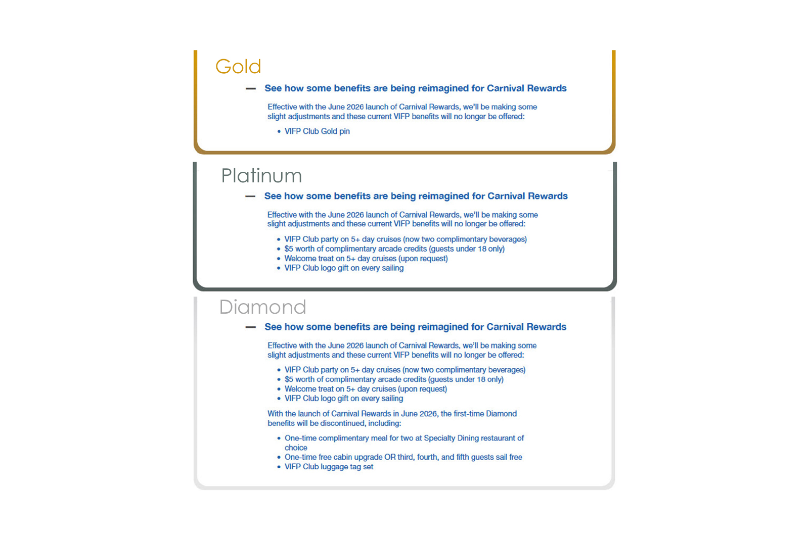 Under the new program – which will take effect on June 1, 2026, without the VIFP branding – Carnival will eliminate the entry-level Blue tier. All other levels (Red, Gold, Platinum and Diamond) will remain. Cruisers who are currently Blue, as well as new Carnival passengers, will be Red under Carnival Rewards.